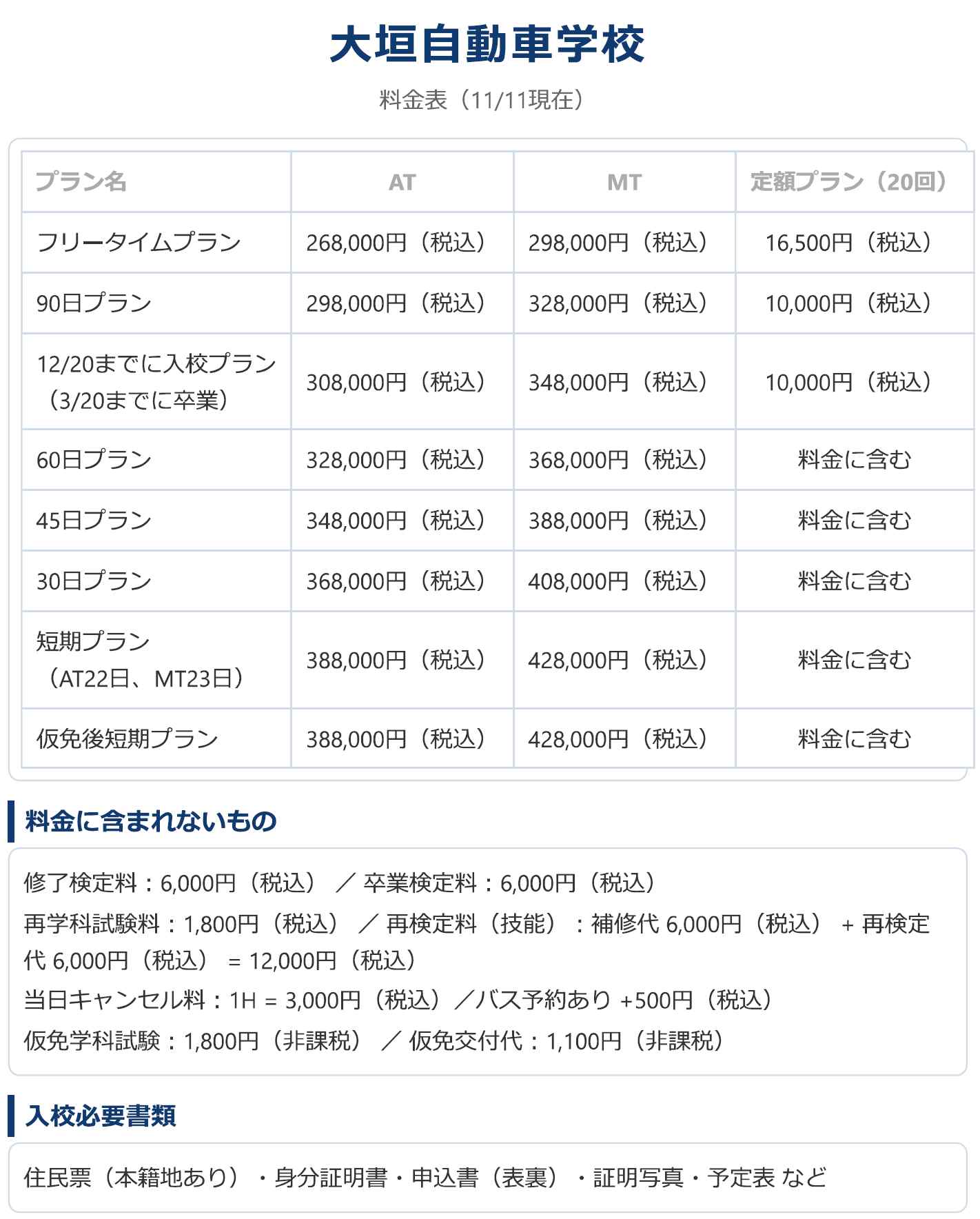 2025年(令和7年)11月入校料金(2025年11月11日更新)